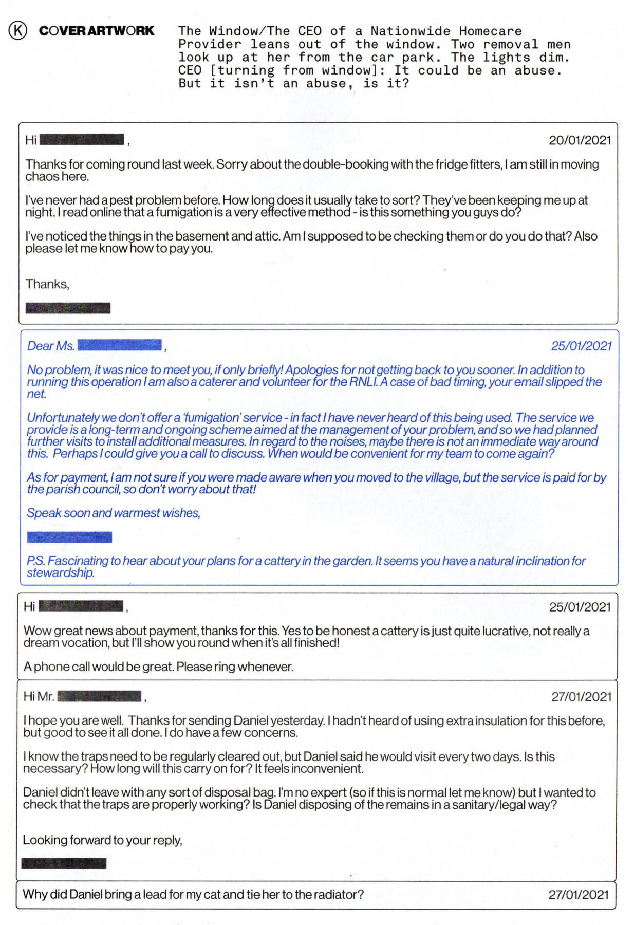 The CEO of a Nationwide Homecare Provider leans out of the window. Two removal men look up at her from the car park. The lights dim. CEO [turning from window]: It could be an abuse. But it isn’t an abuse, is it?