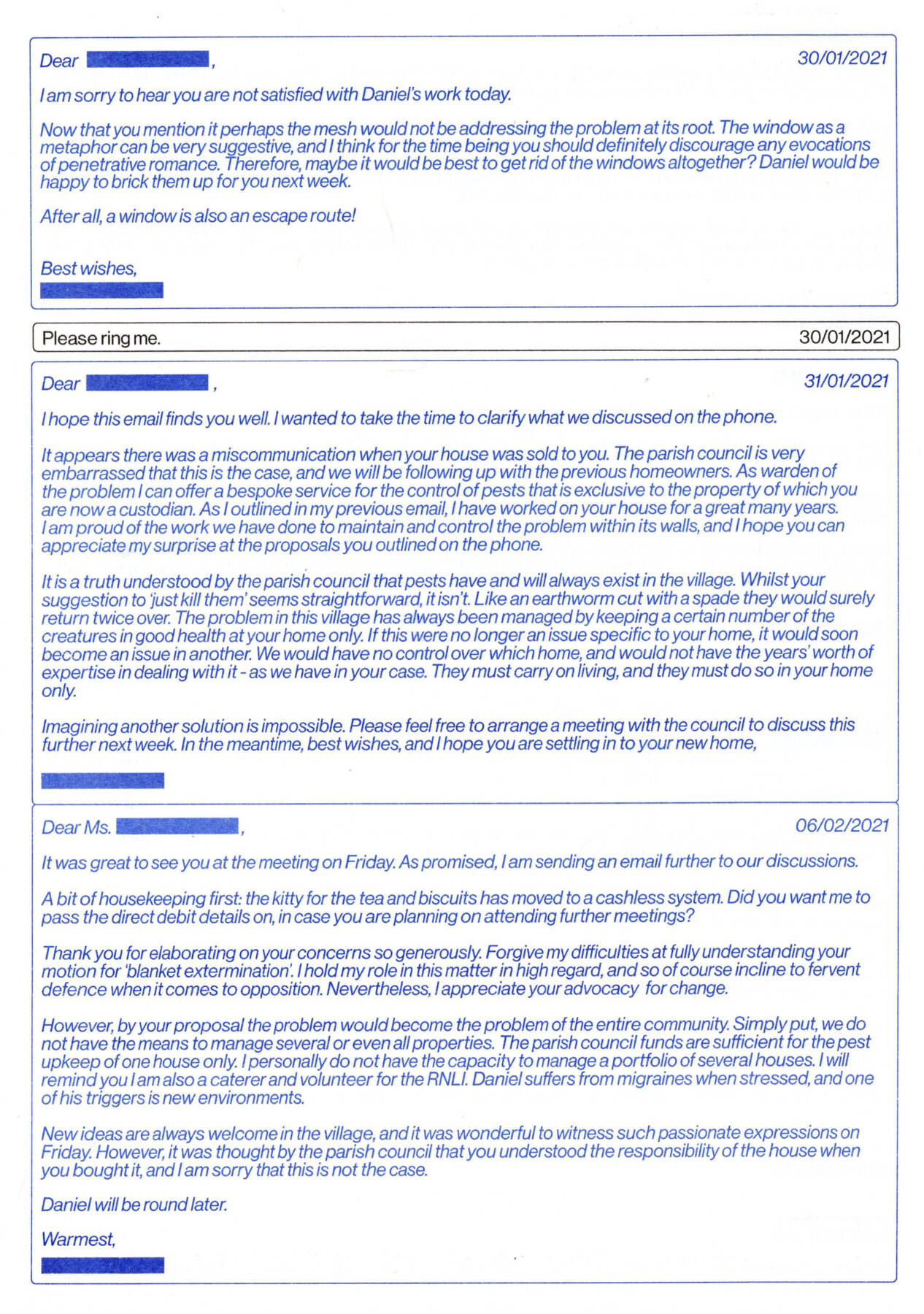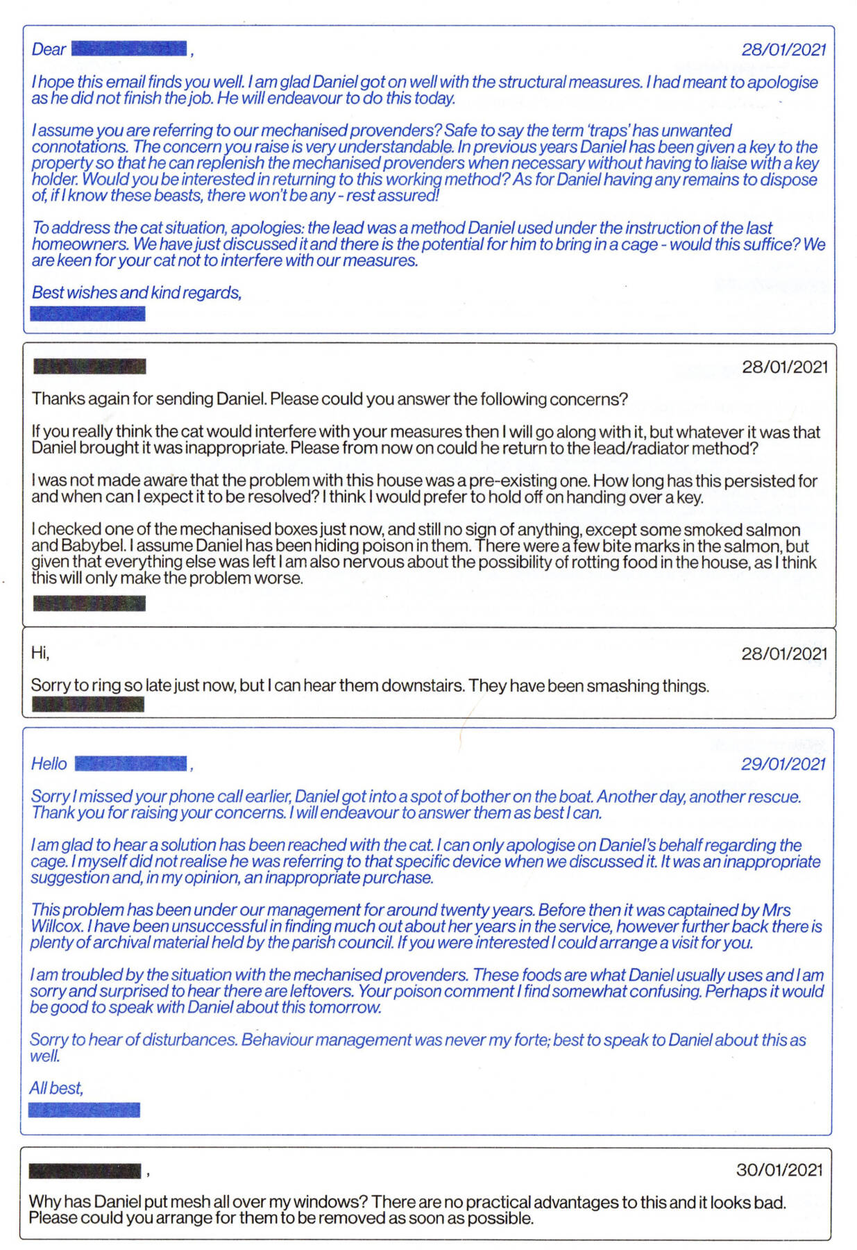 An Estate Agent and his Apprentice enter a double room with brown carpets. The Apprentice points at the stained divan. The Estate Agent turns to the audience, mopping his forehead. The Apprentice moves around the divan, checking underneath it, sitting on different areas, bouncing. Estate Agent: Any complaints? Apprentice: [still bouncing]: Hard work – hard work – not complaining – but very weak – wrestling bouts every night.